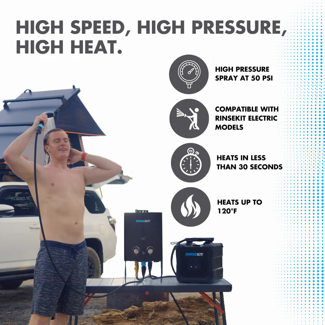 ⚠ Remarque : Il s'agit d'un chauffe-eau à gaz propane sans réservoir qui nécessite la puissance d'un RinseKit PRO, Cube ou Rack Shower pour fonctionner. Ce n'est pas un produit autonome.