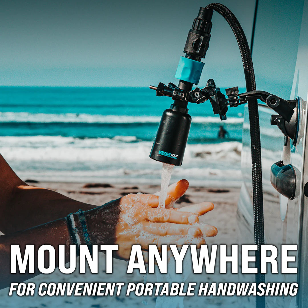 Lorsqu'il est connecté au RinseKit via l'adaptateur à raccord rapide sur le tuyau, l'Auto-Nozzle distribue de l'eau d'un simple geste de la main. Il peut également être fixé sur n'importe quelle surface avec le support à ventouse, vous permettant ainsi de mettre en place une station de lavage des mains sans contact au camping, sur le parking, ou partout où la vie vous mène.